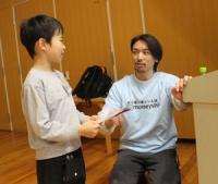 東京都の武蔵野市立大野田小学校で、3年生約115名全員が参加して「総合的な学習の時間」で行われていたのは「投資」の勉強だった。(写真はにぐ先生こと谷口達也氏(右)と小学3年生の中村光志さん)